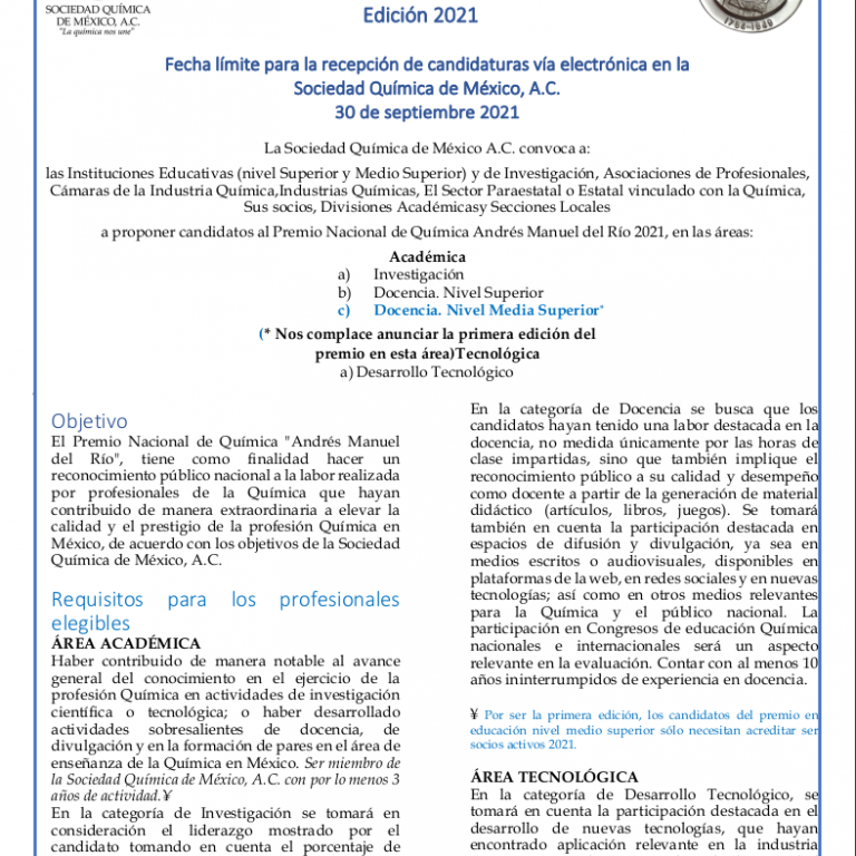 Convocatoria para el Premio Nacional de Química Andrés Manuel del Río Edición 2021