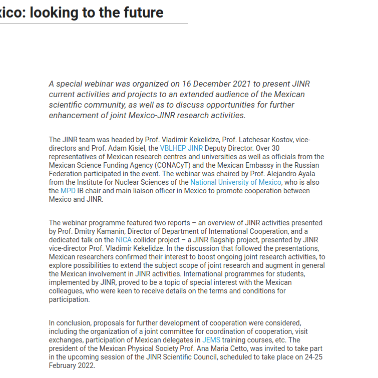 La comunidad científica mexicana y el JINR exploran mecanismos paraincrementar la cooperación bilateral
