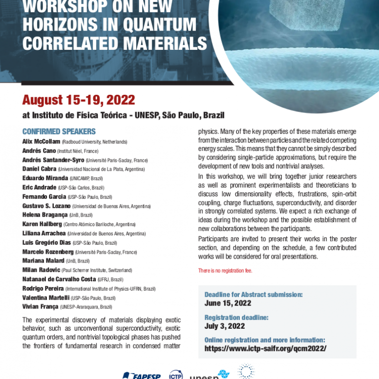 ICTP-SAIFR Workshop on New Horizons in Quantum Correlated Materials (August 15-19, 2022)