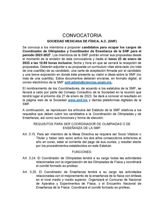 Se convoca a los miembros a proponer candidatos para ocupar los cargos de Coordinador de Olimpiadas y Coordinador de Enseñanza de la SMF para el periodo 2023-2027