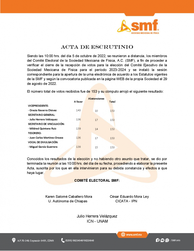 Cierre de la recepción de votos para la elección del Comité Ejecutivo de la Sociedad Mexicana de Física para el período 2023-2024