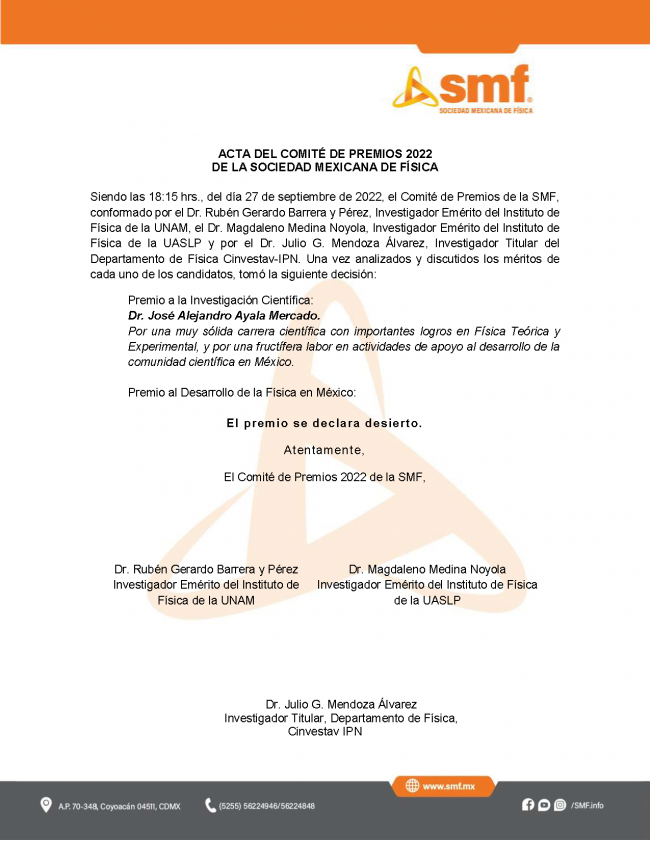 Acta del Comité de Premios 2022 de la Sociedad Mexicana de Física