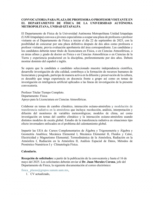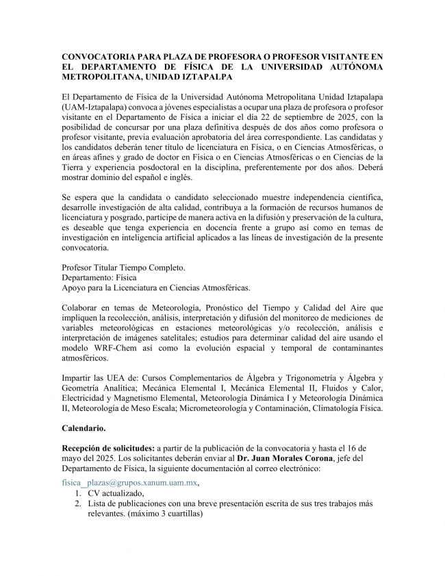Convocatoria Para Plaza De Profesora O Profesor Visitante En El Departamento De Física De La Universidad Autónoma Metropolitana, Unidad Iztapalapa
