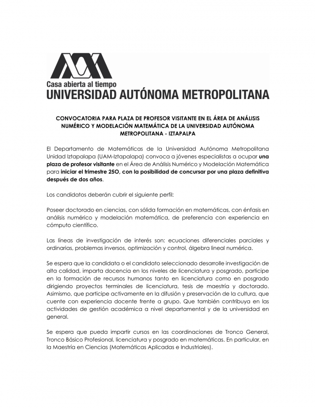 CONVOCATORIA PARA PLAZA DE PROFESOR VISITANTE EN EL ÁREA DE ANÁLISIS NUMÉRICO Y MODELACIÓN MATEMÁTICA DE LA UNIVERSIDAD AUTÓNOMA METROPOLITANA – IZTAPALPA
