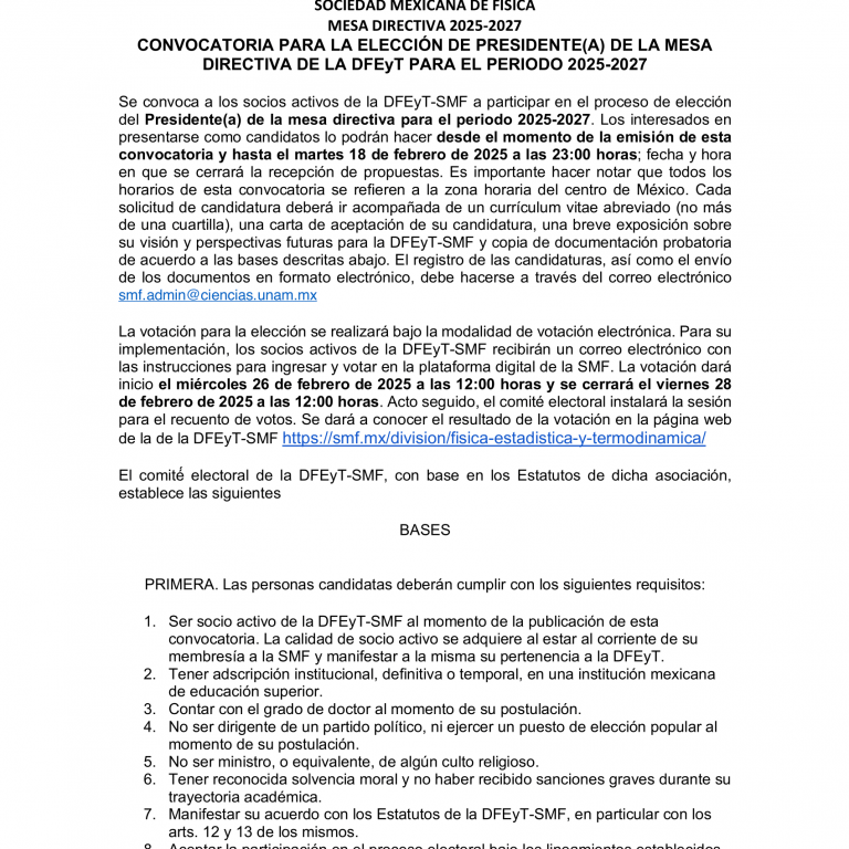 CONVOCATORIA PARA LA ELECCIÓN DE PRESIDENTE(A) DE LA MESA DIRECTIVA DE LA DFEyT PARA EL PERIODO 2025-2027