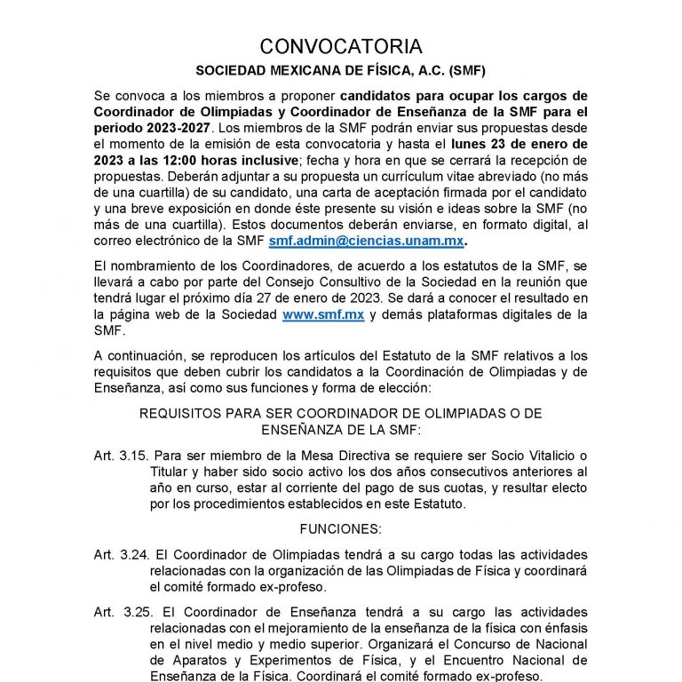 Se convoca a los miembros a proponer candidatos para ocupar los cargos de Coordinador de Olimpiadas y Coordinador de Enseñanza de la SMF para el periodo 2023-2027